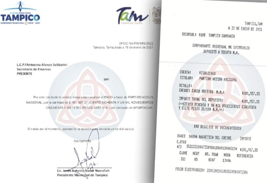 Tampico, Tam.- Una revisión exhaustiva de documentos, solicitudes firmadas y comprobantes bancarios obtenidos por Noticias PC expone una secuencia administrativa que vincula decisiones tomadas desde la presidencia municipal de Tampico con una aportación económica dirigida al Partido Acción Nacional (PAN) en enero de 2021, en un contexto político marcado por la búsqueda de continuidad en el cargo.