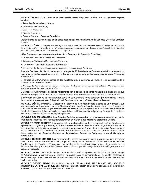 gubernamental para la creación de la empresa de participación estatal mayoritaria denominada “Tamaulipas se transforma, S.A. de C.V.”, que trabajará como un brazo aliado de la Secretaría de Desarrollo Energético del estado.