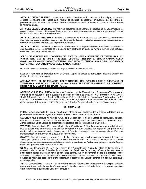 Ciudad Victoria, Tamaulipas.- El lunes 06 de abril fue publicado en la versión vespertina del Periódico Oficial del Gobierno del Estado de Tamaulipas, el decreto